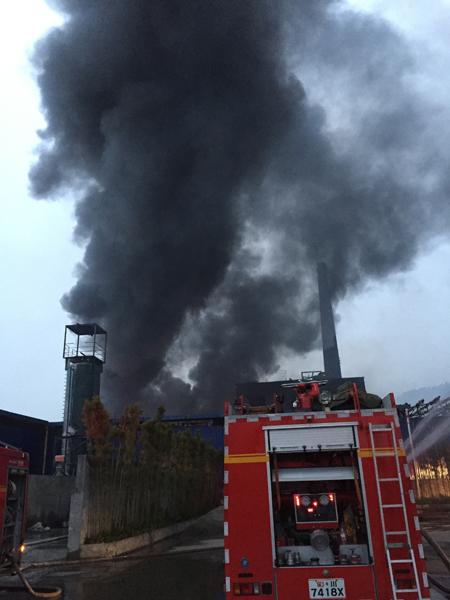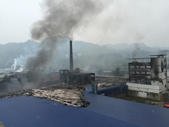 接到報警后,宜賓消防支隊下屬7個中隊、19輛各類消防車、100余名消防官兵迅速趕到現(xiàn)場進行處置,同時,支隊戰(zhàn)勤保障大隊緊急調集4噸泡沫滅火藥劑趕赴現(xiàn)場。消防官兵到達現(xiàn)場后,經(jīng)偵查沒有發(fā)現(xiàn)無人員被困。只見現(xiàn)場濃煙滾滾,一棟四層建筑和旁邊兩座鋼結構廠房起火,過火面積較大,廠房石棉瓦頂棚和內部可燃物正在劇烈燃燒,燃燒物質有油、P2O4有機溶劑和裝硫酸鋅的膠桶等,現(xiàn)場情況十分危急。