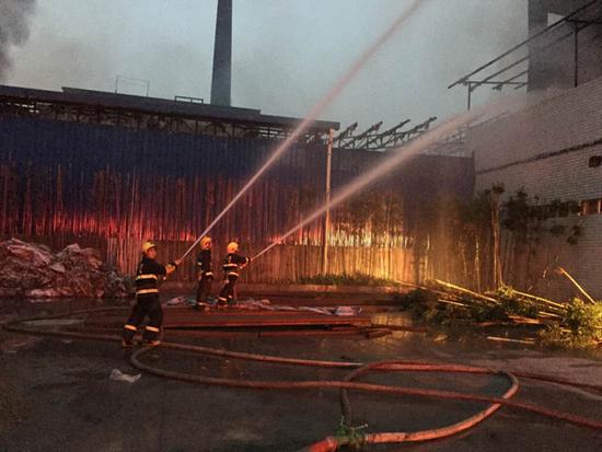 消防官兵在起火點周圍分別架設水槍水炮以及高噴消防車對火勢進行壓制。針對燃燒物質為P2O4有機溶劑和裝硫酸鋅的特殊情況,現(xiàn)場指揮部對滅火作戰(zhàn)力量進行重新分配,集中優(yōu)勢兵力、優(yōu)勢裝備,采用泡沫水槍對起火點進行全方位覆蓋。大火于早上6點50左右被成功控制,由于鋼結構建筑已完全坍塌,內部仍存在部分余火,消防部門現(xiàn)場調來挖掘機對廠房進行拆除,對挖出的可燃物質及時進行水槍覆蓋。