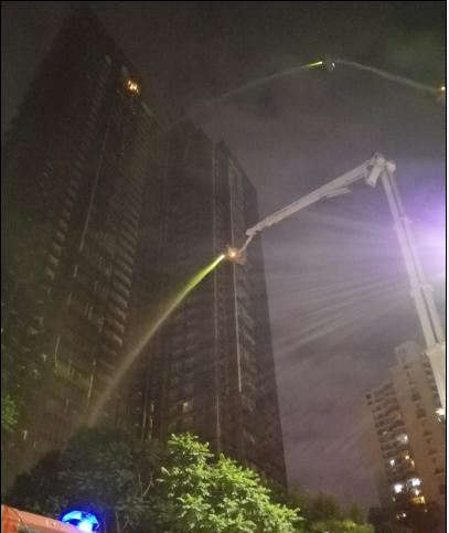 不久,現(xiàn)場消防車增至22輛、消防官兵增至110多名。兩臺消防高噴車在外圍控制了火勢蔓延。消防員攜帶救援器材,繼續(xù)徒步上樓,逐層內(nèi)攻搜索排查。至21時45分,火災被完全撲滅。