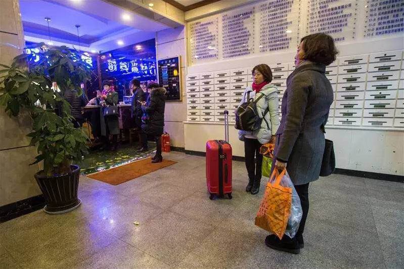.東門(mén)大廈這邊有兩個(gè)酒店:東門(mén)賓館和布丁酒店。晚上8點(diǎn)多,住客都被叫起來(lái)?!百e館把我們趕下來(lái)了,說(shuō)火勢(shì)太大,怕蔓延過(guò)來(lái)。”布丁酒店一個(gè)年輕女孩蹲在大門(mén)旁邊,呆呆地看著來(lái)來(lái)往往的行人。她實(shí)在無(wú)聊,便抽起了煙。圖為緊鄰火場(chǎng)的一家賓館,住客紛紛退房離開(kāi)。