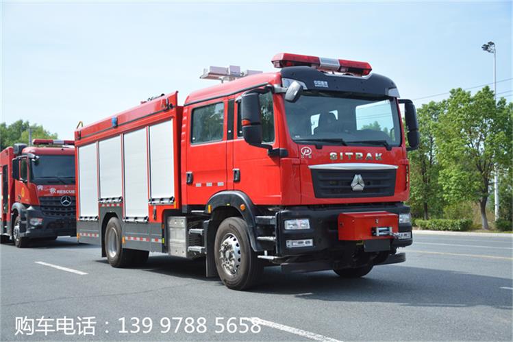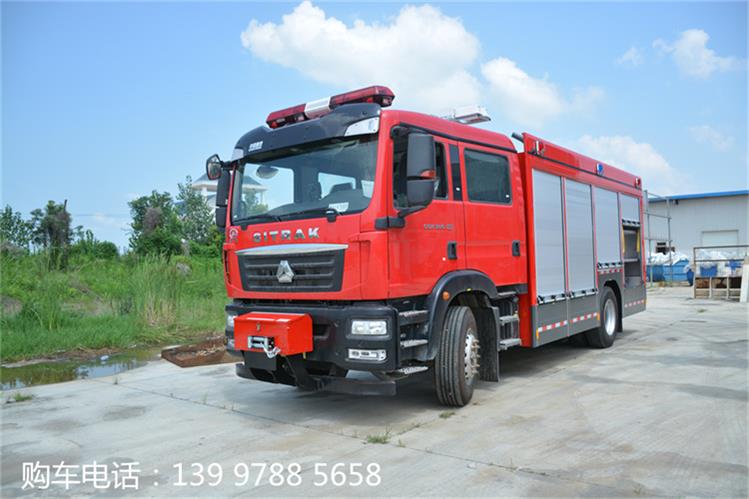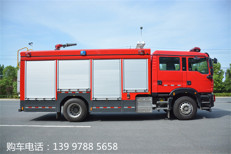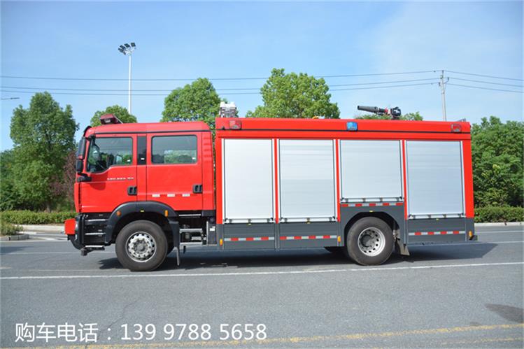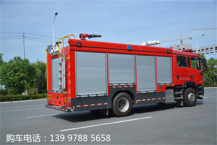 JDF5180GXFAP55/Z6壓縮空氣泡沫消防車由中國(guó)重汽汕德卡底加裝而成的;罐體總?cè)莘e5.6立方,其中A類泡沫罐容積0.35立方,B類泡沫罐容只0.55立方,水罐容積4.7立方。